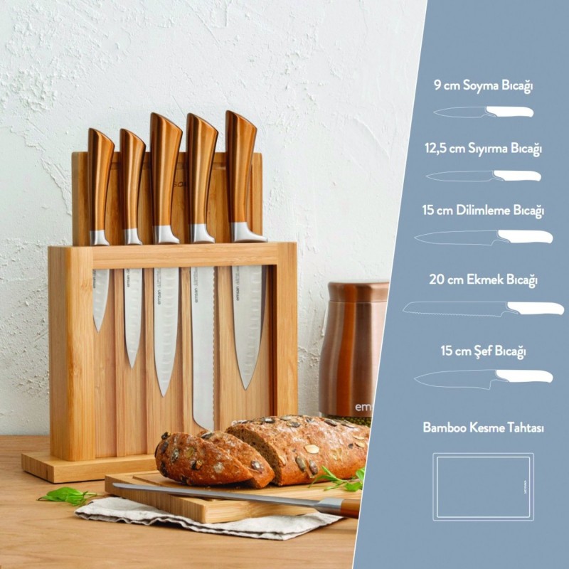 ست چاقوی آشپزخانه 7 پارچه امسان مدل Emsan Matriks Rose Gold با طراحی شیک،فضایی را روی پیشخوان شما اشغال نمی کند و با تخته برش ساخته شده از مواد مخصوص بامبو،همه چیز مورد نیاز شما را یکجا ارائه می دهد.در صورت استفاده صحیح از چاقوها،این ست تا سالیان متمادی تیزی خود را از دست نخواهد داد.دسته های ارگونومیک و خوش فرم چاقوها استفاده راحت و سریع از آنها را فراهم می کند.