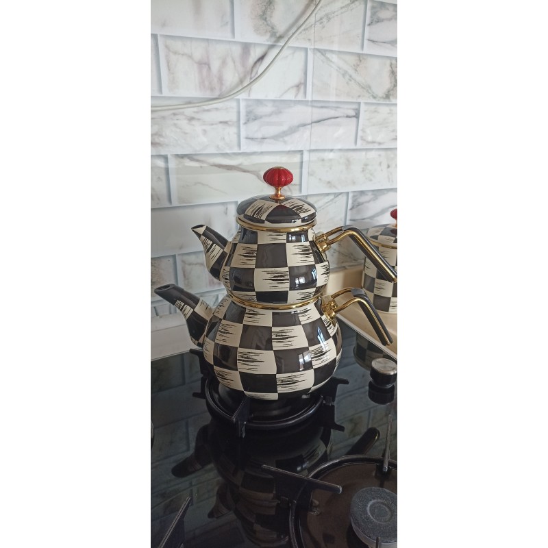 ست کتری و قوری لعابی آجار مدل شطرنجی Qualita King tombul با ظاهری متفاوت شطرنجی و جذاب و دارای مقاومتی بسیار بالا در برابر حرارت می تواند گزینه خوبی برای سلیقه های متفاوت باشد ست کتری و قوری لعابی آجار مدل شطرنجی Qualita King tombul ساخته شده از جنس فلز مرغوب با لعاب آنتی باکتریال مقاوم در برابر خش و رنگی ثابت یکی ار بهترین مدل های کتری و قوری های برند آجار میباشد این ست کتری و قوری شطرنجی ترک با گنجایش کتری 2 لیتر و گنجایش قوری 1 لیتر میتواند جوابگوی خانواده های پر جمعیت و دورهی ها باشد . کتری و قوری لعابی شطرنجی آجار مدل Qualita King alt-ust بسیار سبک بوده و حمل و نقل و شستشوی آن بسیار آسان می باشد همچنین قابلیت شستشو درماشین طرف شویی را نیز دارد.