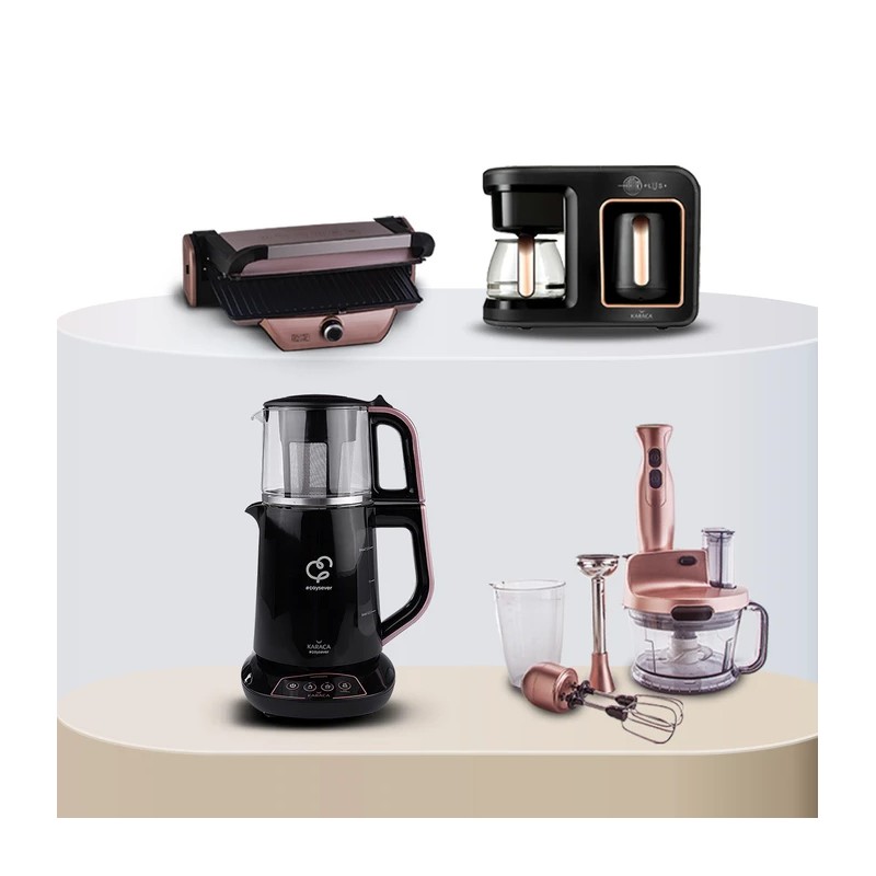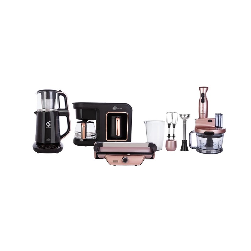 این پک شامل لوازم برقی ضروری و مهم آشپزخانه است که برای خرید تک تک آنها باید تحقیق و بررسی زیادی انجام دهیم .در این مجموعه همه این لوازم با کیفیت عالی و گارانتی 2 سال به رنگ رزگلد گردآوری شده است این پک یک پیشنهاد عالی است که شامل قهوه ساز ، چای ساز ، کتری برقی ، ربات غذا ساز و ساندویچ ساز می باشد.در ادامه هر کدام از لوازم به صورت کامل مورد بررسی قرار میگیردتا با خیال راحت و بررسی کامل این پک را خریداری کنید: