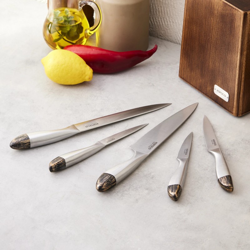 سرویس چاقو 6 پارچه کاراجا Dynamic،علاوه بر کارایی و طراحی، فوق العاده همه کاره است و می تواند انواع غذاها را از میوه ها و سبزیجات لطیف گرفته تا گوشت های سفت و نان را اداره کند. این باعث میشود آن را برای هر کار آشپزی، چه تهیه یک سالاد ساده یا ایجاد یک مهمانی مفصل، به مجموعهای عالی تبدیل کند.