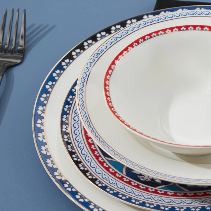 رنگ سفید کلاسیک ست، ظرافتی را به چیدمان میز شما میافزاید، در حالی که طراحی پیچیده باستانی در اطراف لبهها، طعمی منحصر به فرد و هنری میافزاید. این ست شام نه تنها از نظر زیبایی شناسی دلپذیر است، بلکه کاربردی و نگهداری آن آسان است تطبیق پذیری این مجموعه آن را برای هر آشپزخانه مدرنی ضروری می کند و هم سبک و هم کارایی را ارائه می دهد.