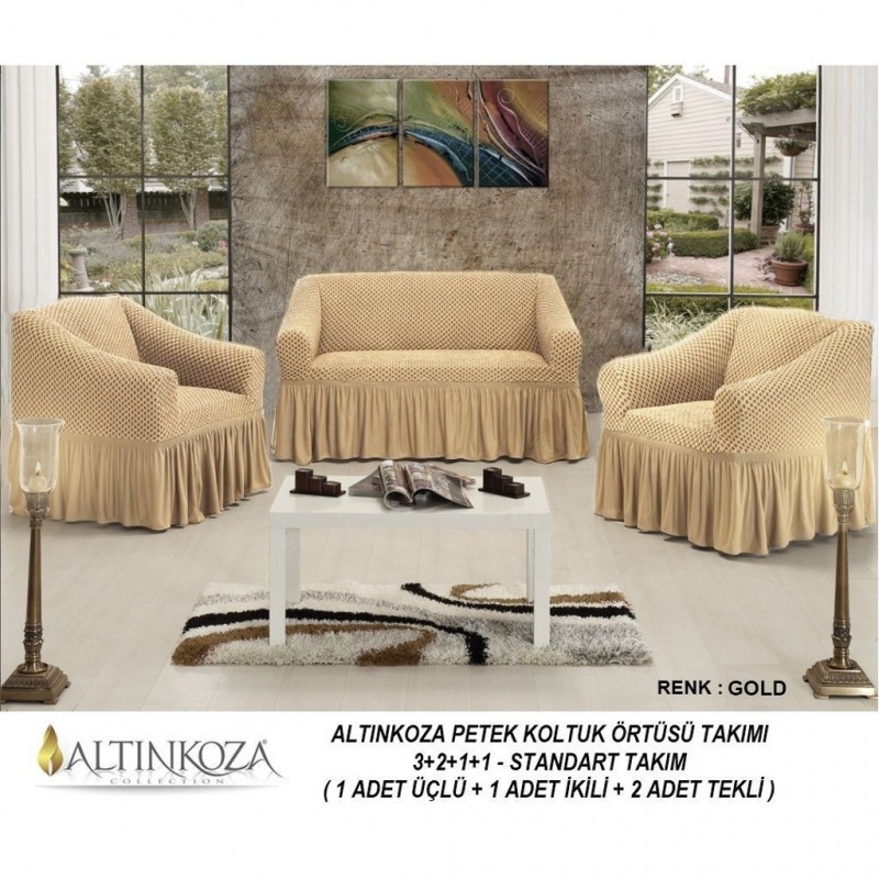 کاور مبل 8 نفره آلتین کوزا مدل لانه زنبوری رنگ طلایی ساخت کشور ترکیه به دلیل دوخت با کیفیت و پارچه ای مرغوب آن با حالت مبل ست می شود و حالت مبل را به خود می گیرد و نمای جدید و بسیار زیبا به مبلمان شما می دهد.
